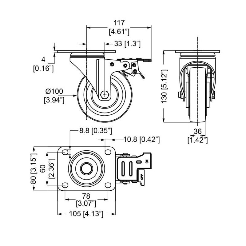 100mm Pöörlev ratas Külje pidur Eriti tugev Tsink/Helepunane