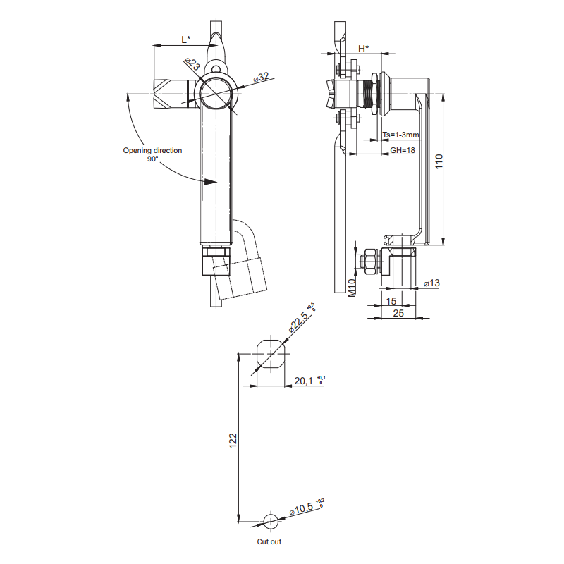 L-käepide Quarter turn 18mm SN tsink kroomitud Non-locking