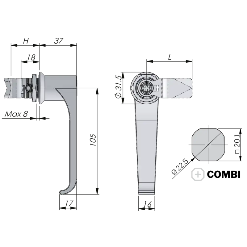L-käepide Quarter turn 18mm SN tsink kroomitud Non-locking