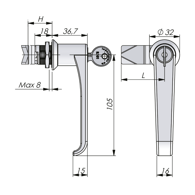 L-käepide Quarter turn 30mm SN AISI 316 Key to differ IP65